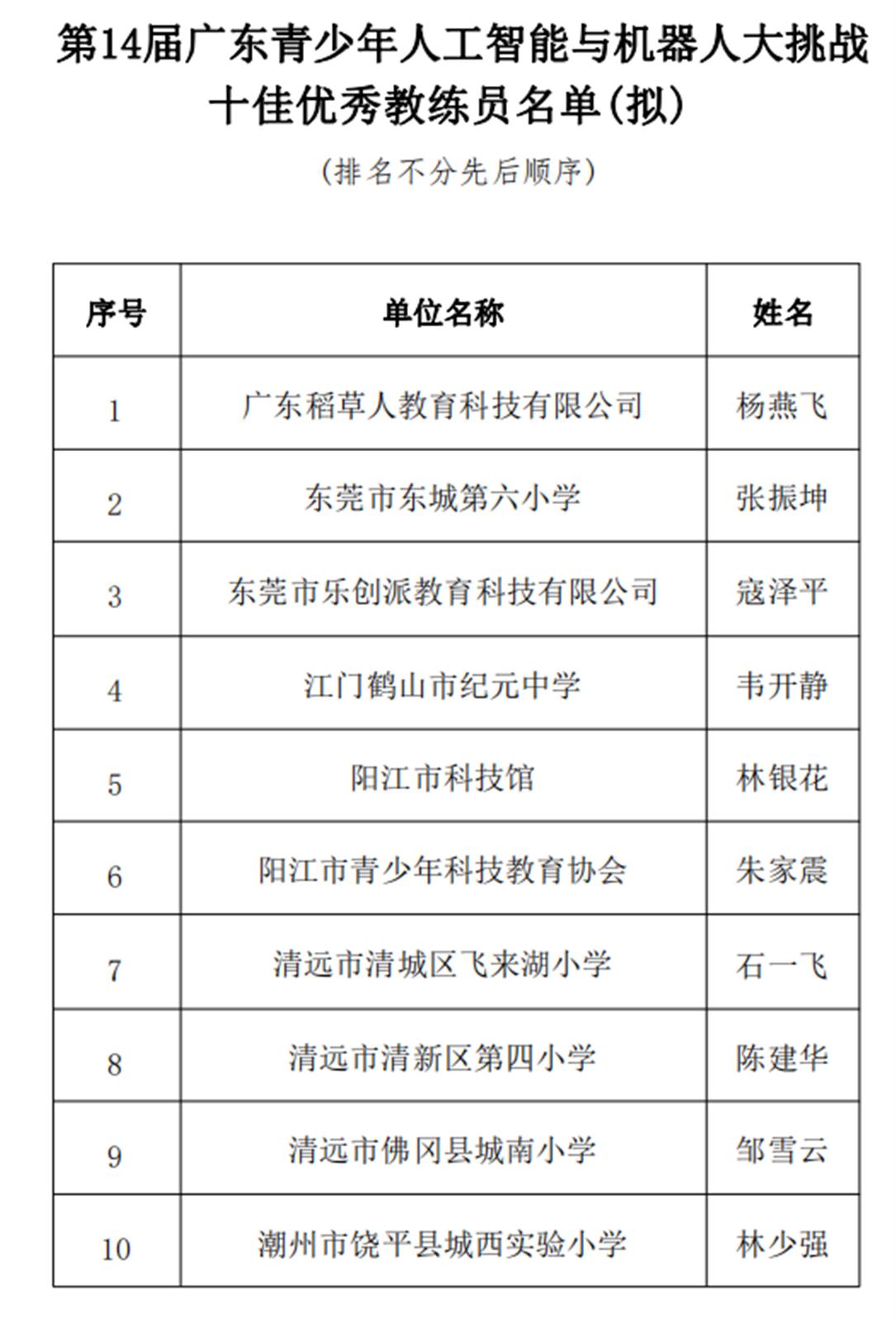 第14届广东青少年人工智能与机器人大挑战十佳优秀教练员名单公示